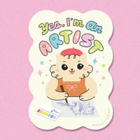 Single affirming "Yes, I'm an Artist Cat" cat sticker with scalloped edges. Illustration of a cream-colored cat painting dogs.